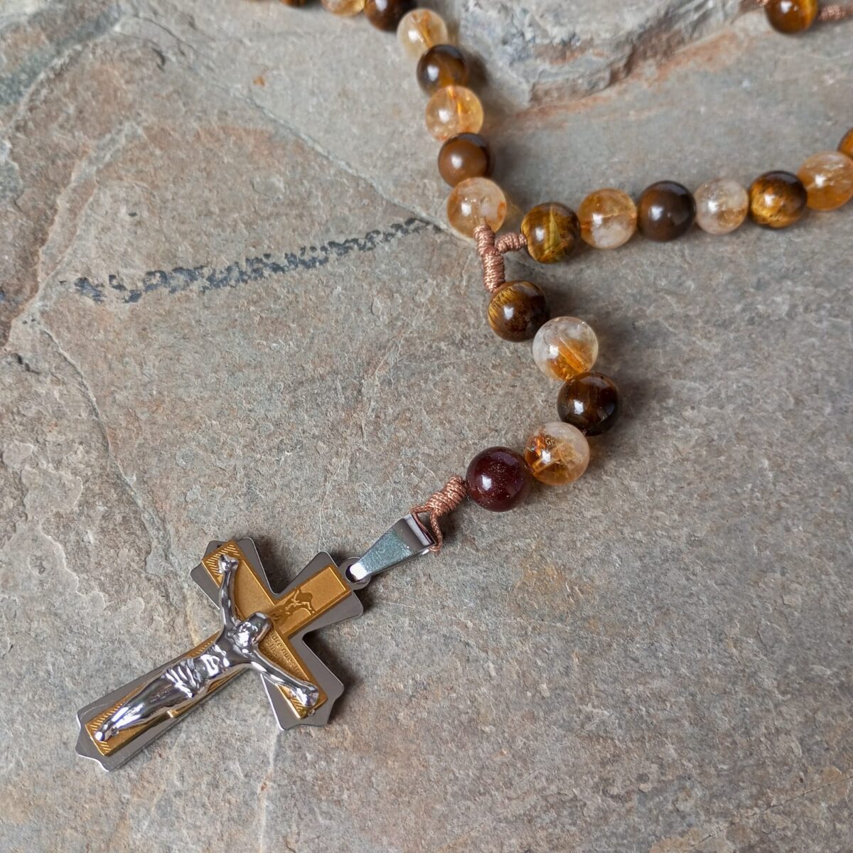 Camándula en Piedras Ojo de Tigre y Citrino con Cruz en Acero