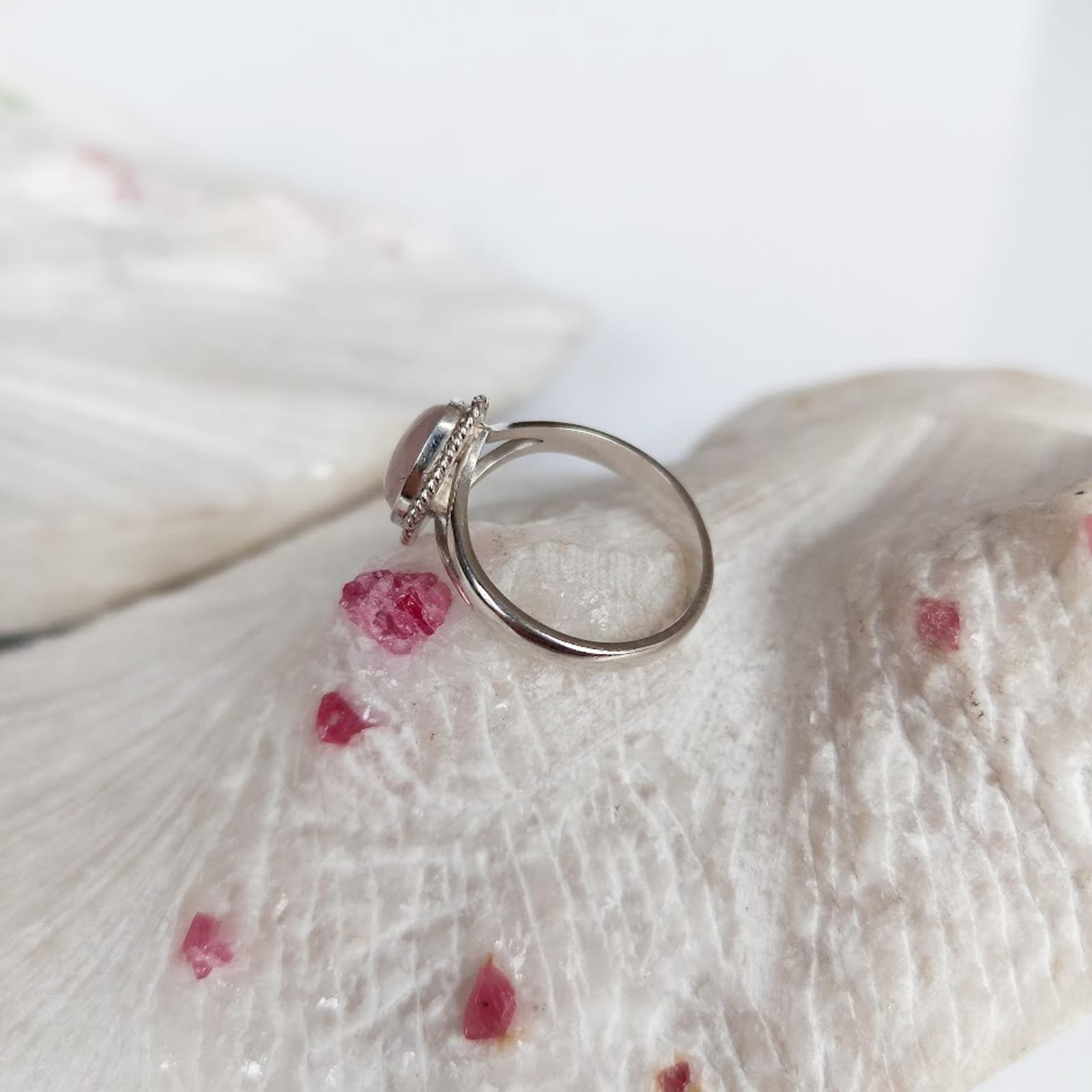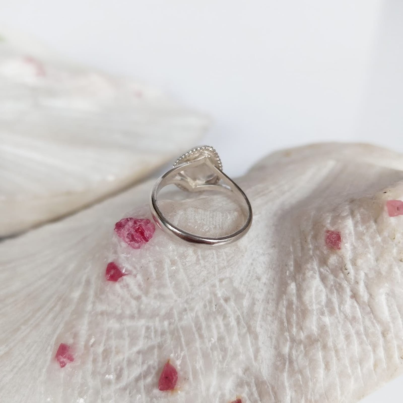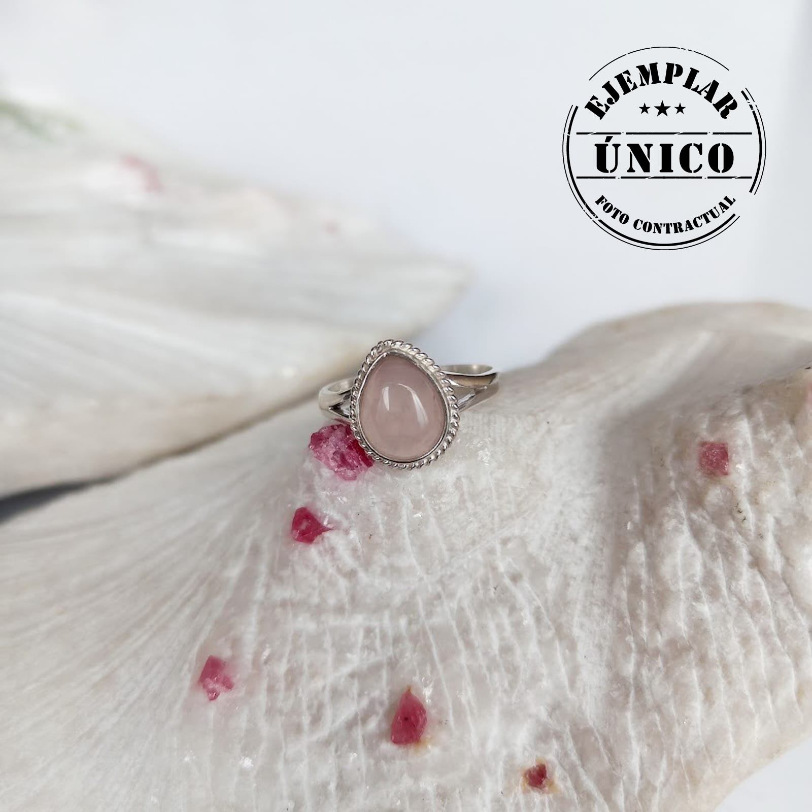 Este anillo está elaborado en plata 925, un metal noble que realza con elegancia la luminosidad natural de la piedra. La gema, tallada en forma de gota pulida, refleja con sutileza sus vetas internas, creando un juego de luz encantador. El borde finamente texturizado que enmarca la piedra añade un toque artesanal y sofisticado, haciendo de esta pieza una joya atemporal. Más que un accesorio, es un símbolo de amor, serenidad y apertura emocional, perfecto para acompañarte día a día o para regalar a alguien especial.