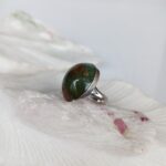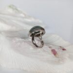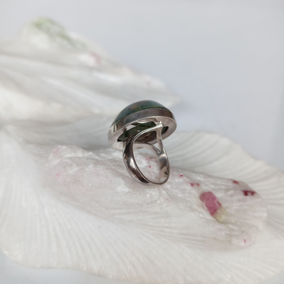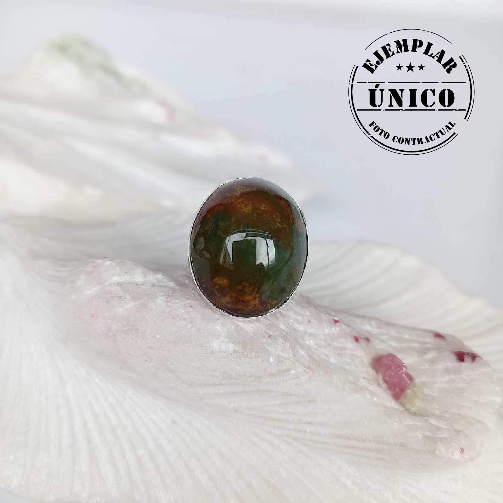 En esta joya, la Ágata Musgo se presenta en un corte cabujón ovalado, que permite apreciar claramente sus vetas orgánicas y matices naturales, haciendo de cada pieza un ejemplar completamente único. La piedra está engastada en plata fina, creando un contraste elegante que realza su belleza terrosa y serena. Su diseño sobrio y atemporal permite que la piedra sea la verdadera protagonista, convirtiéndose en un accesorio con carácter y armonía.
