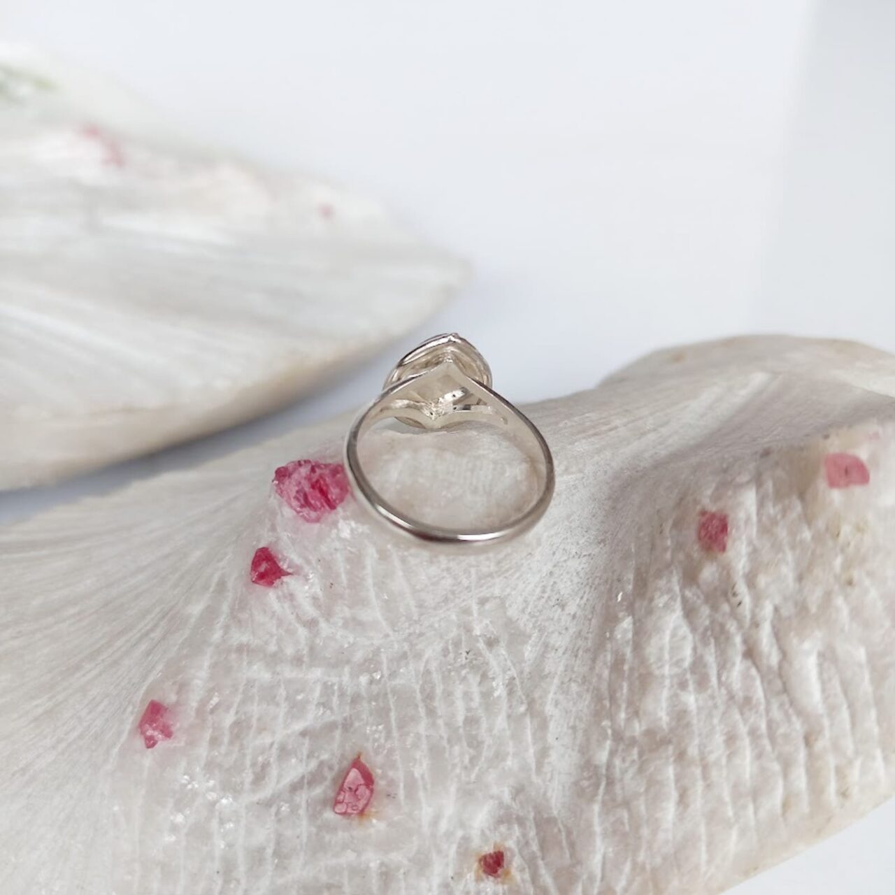 Este anillo está elaborado en plata 925, un metal noble que realza la belleza natural de la piedra. La aventurina ha sido tallada en forma de gota pulida, resaltando su suavidad y profundidad de color. El diseño es delicado y contemporáneo, con líneas limpias que enmarcan elegantemente la gema sin restarle protagonismo. Además de su belleza estética, esta piedra se asocia con la apertura a nuevas oportunidades, la armonía emocional y el equilibrio energético, convirtiéndola en una aliada perfecta para quienes buscan caminar con confianza y calma interior.