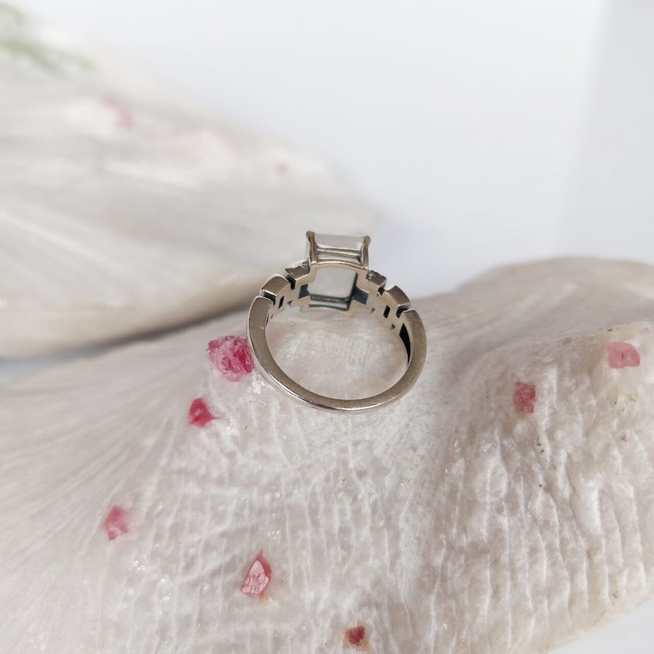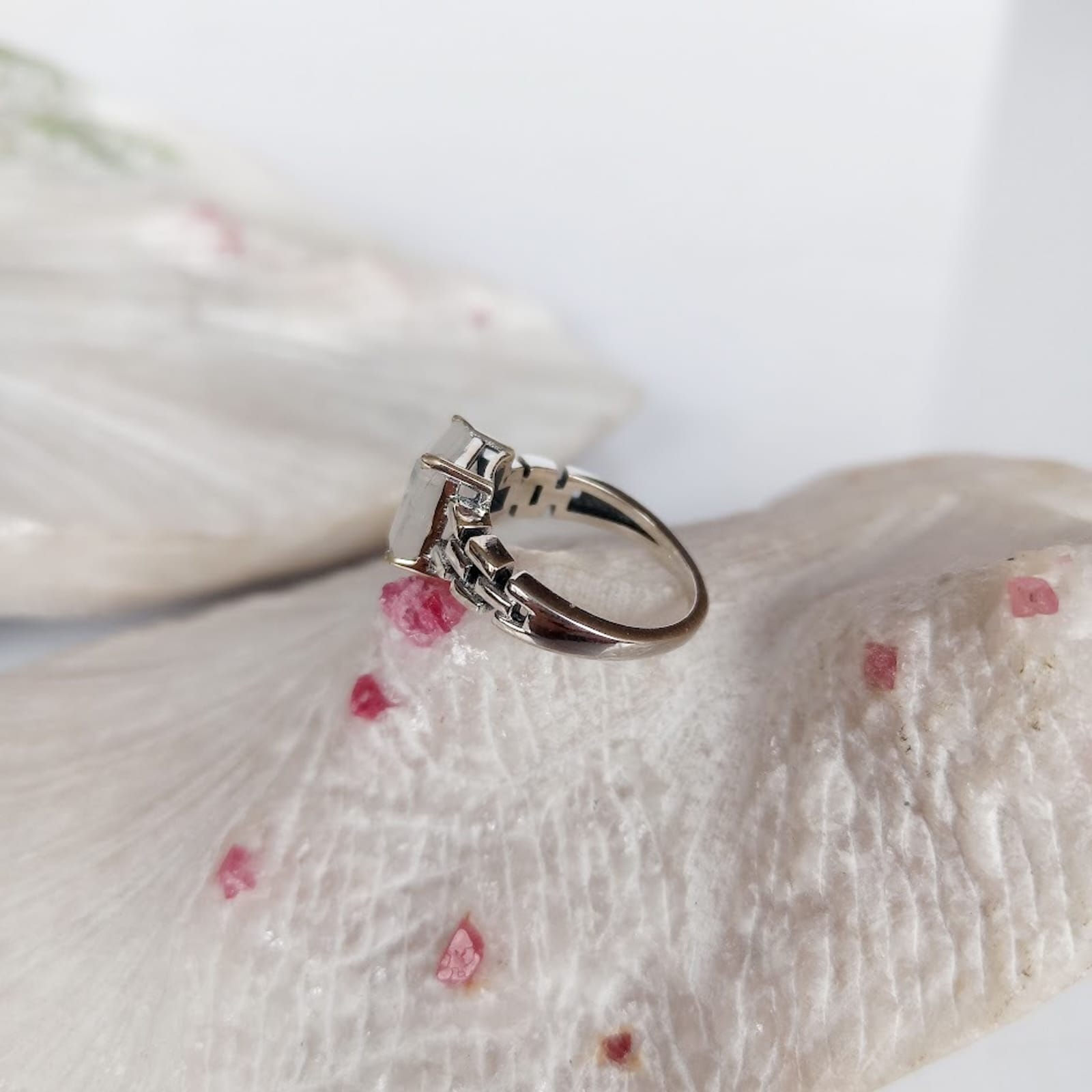 Este anillo está elaborado en plata y presenta una Piedra Luna cuadrada con talla facetada, cuya superficie refleja delicados destellos de luz que cambian según el ángulo. A cada lado de la piedra, el aro muestra un diseño tipo cadena, que aporta carácter y un toque moderno, mientras que el resto del aro es liso, creando un contraste elegante y equilibrado. Una pieza única, perfecta para quienes buscan una joya con energía sutil, belleza etérea y una conexión especial con lo interior.