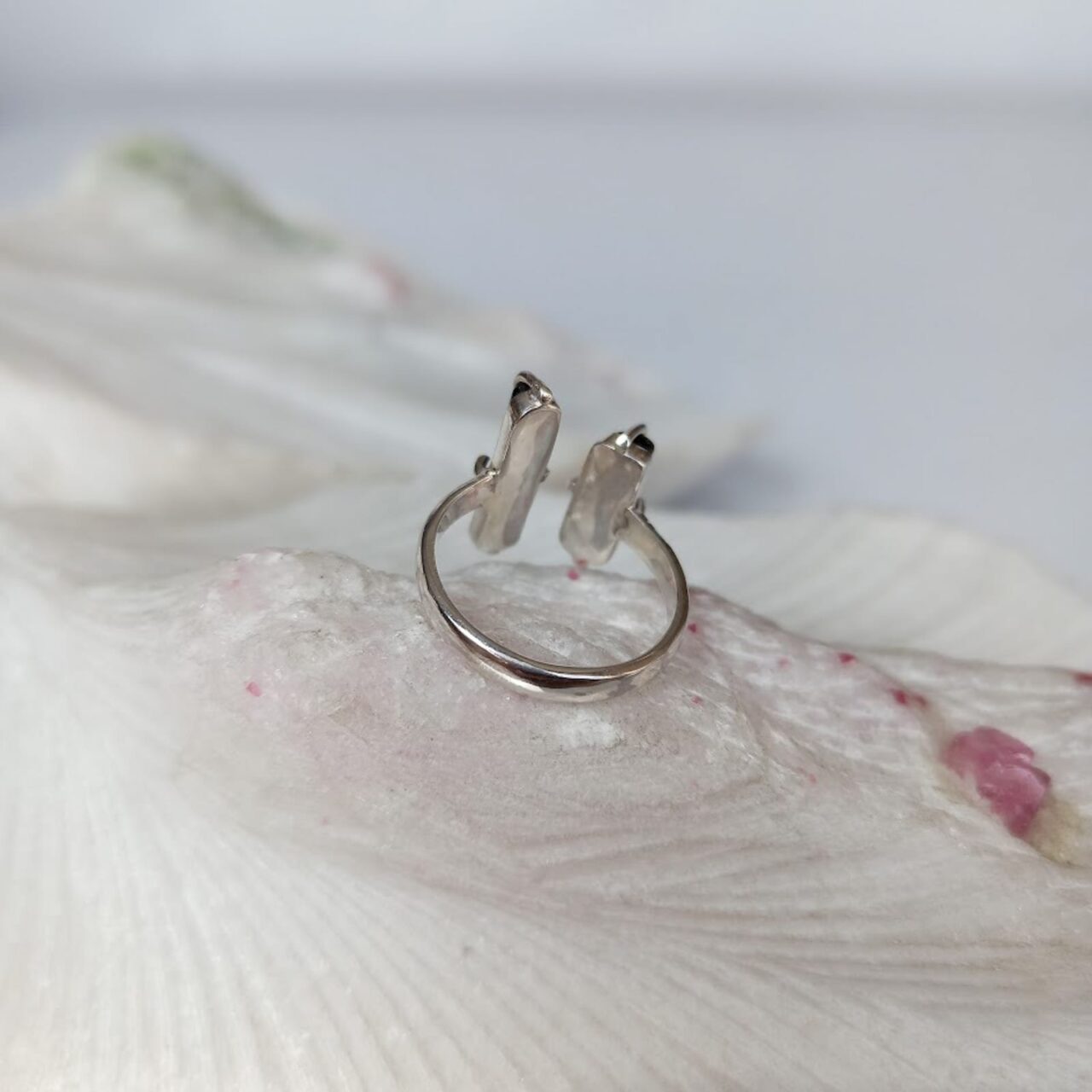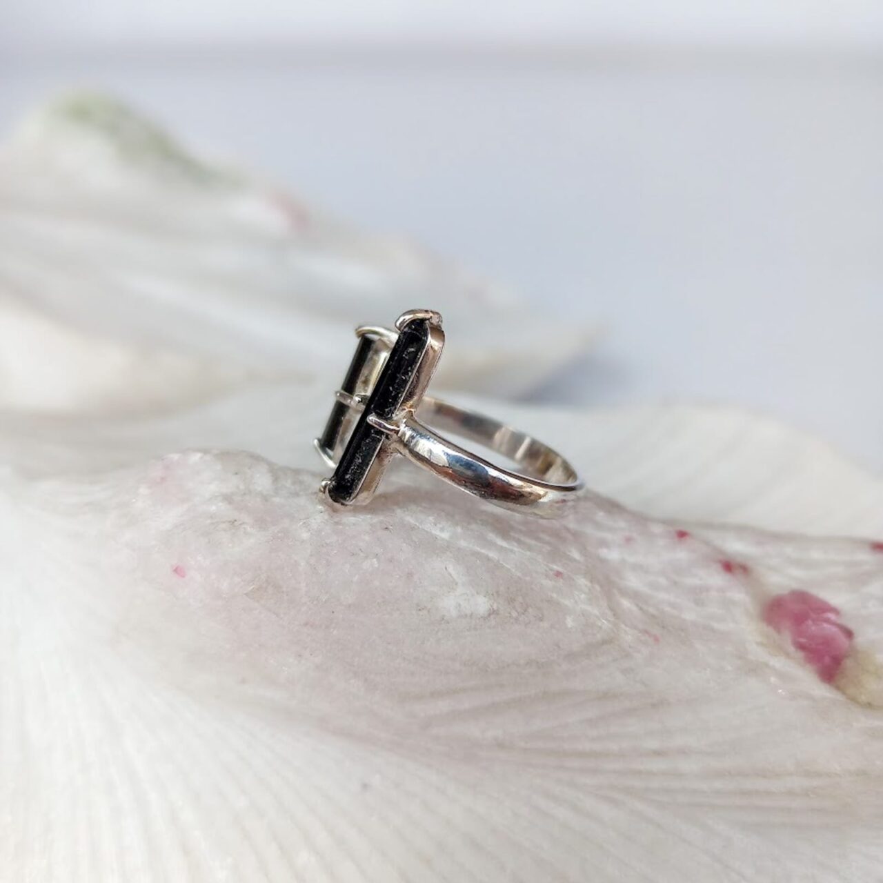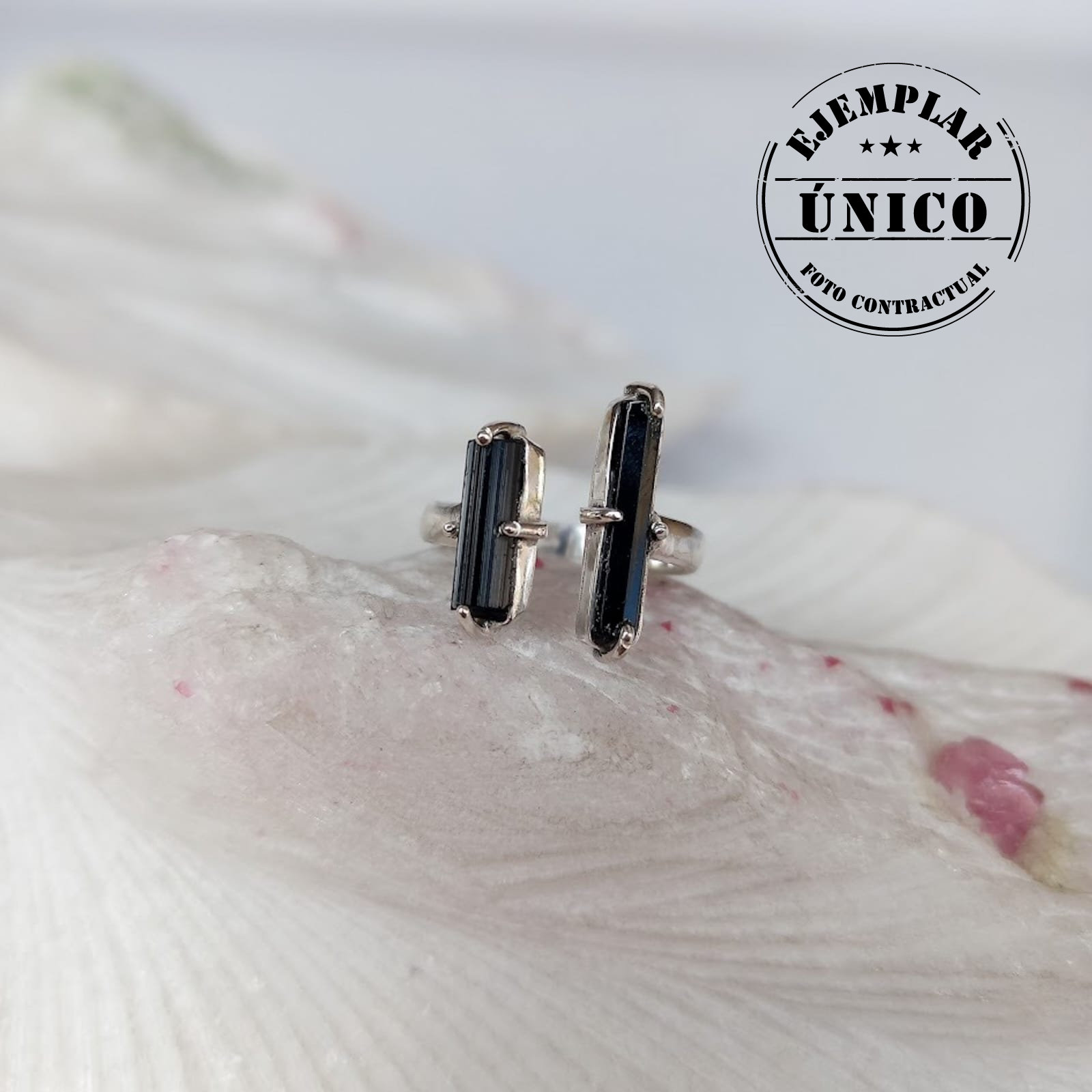 Su belleza radica en su forma natural: prismática, intensa y profundamente negra, con sutiles destellos que reflejan la luz de manera elegante. Esta pieza conserva la textura auténtica de la piedra en bruto, resaltando su fuerza y carácter único. El diseño en plata 925 enmarca dos fragmentos de Turmalina, creando una composición equilibrada que potencia su energía y otorga un estilo moderno y sofisticado. La plata, además de aportar brillo y durabilidad, realza la potencia protectora de la piedra.