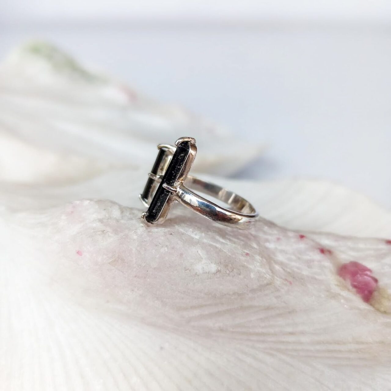 Su belleza radica en su forma natural: prismática, intensa y profundamente negra, con sutiles destellos que reflejan la luz de manera elegante. Esta pieza conserva la textura auténtica de la piedra en bruto, resaltando su fuerza y carácter único. El diseño en plata 925 enmarca dos fragmentos de Turmalina, creando una composición equilibrada que potencia su energía y otorga un estilo moderno y sofisticado. La plata, además de aportar brillo y durabilidad, realza la potencia protectora de la piedra.