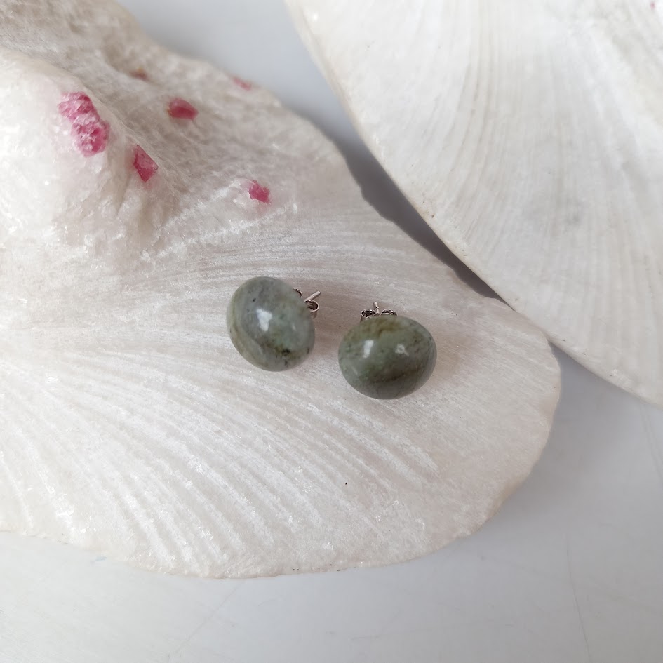 Estos aretes están elaborados en plata y cuentan con Labradorita en forma redonda, un formato clásico que resalta de manera equilibrada los reflejos naturales de la piedra. Su sistema es tipo poste, lo que brinda un ajuste cómodo y seguro, ideal para el uso diario. Una pieza versátil donde la sutileza del diseño permite que la luz de la labradorita sea la protagonista.