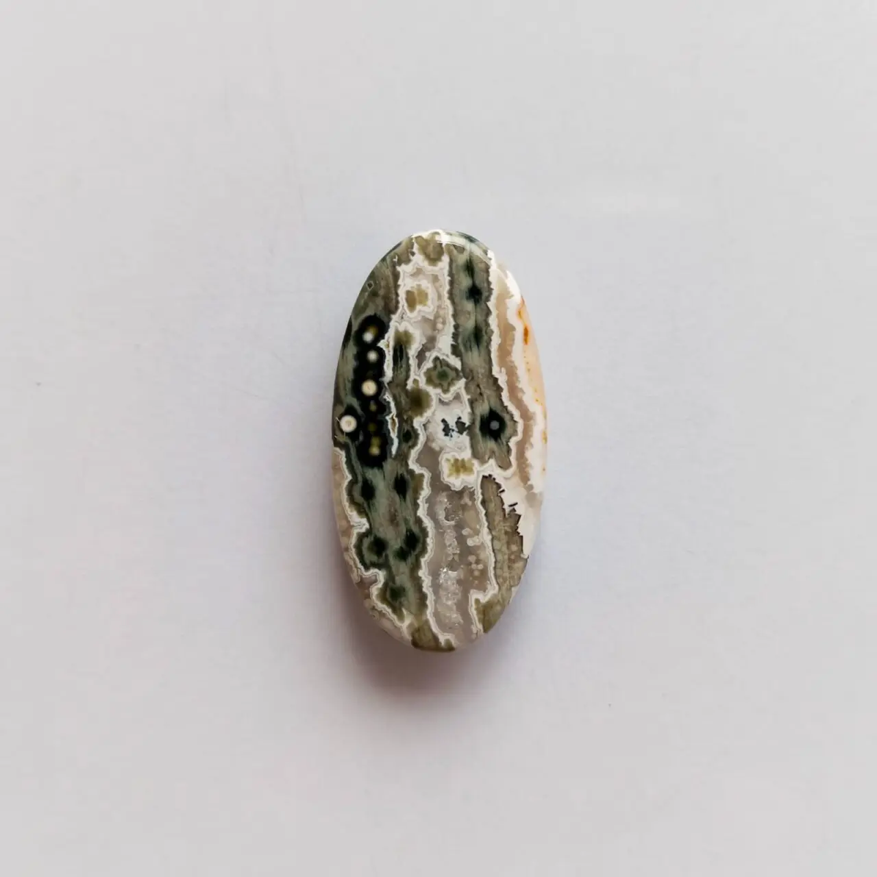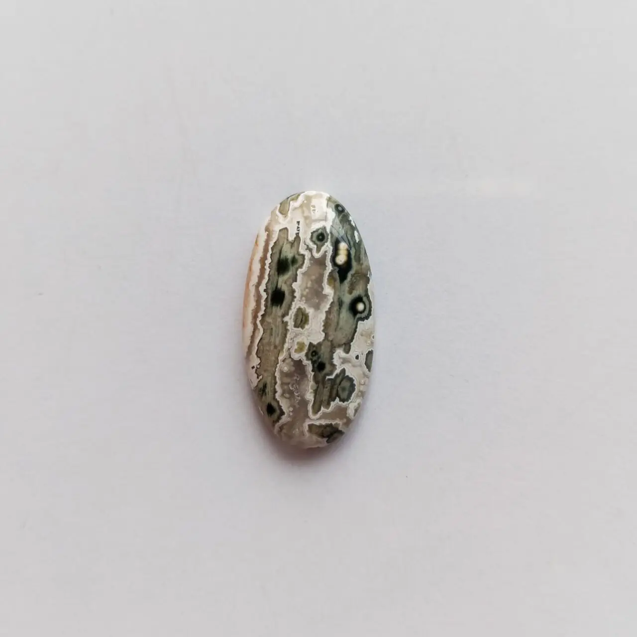 Este cabujón de Jaspe Oceánico es ideal para incorporar en joyería, terapias o como amuleto personal. Con sus patrones únicos que evocan paisajes marinos y formas ondulantes, esta pieza es un reflejo de la tranquilidad de la naturaleza, combinando tonos suaves de verdes, grises, rosados y terrosos. Se considera que el Jaspe Oceánico promueve la paz interior y el equilibrio emocional, lo que lo convierte en un excelente complemento tanto para llevarlo cerca como para usos terapéuticos.