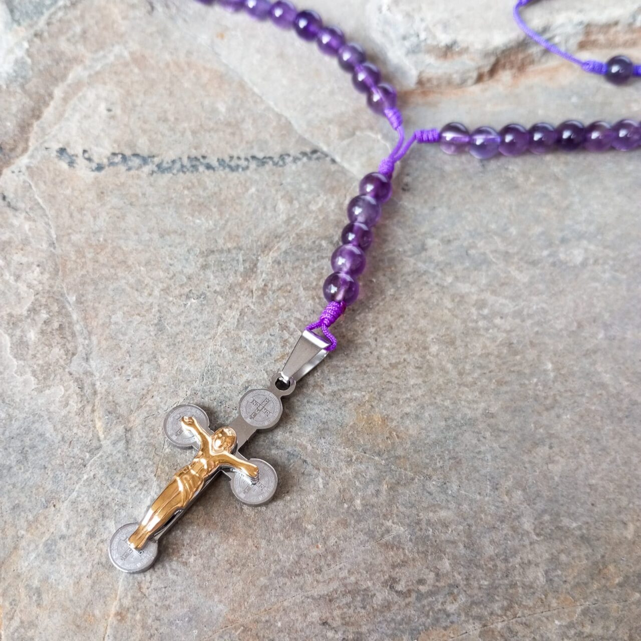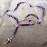Cada camándula es hecha a mano, lo que la convierte en una pieza única, no solo por las variaciones naturales de la amatista, sino también por su forma, estilo y la combinación particular de la cruz con sus piedras. No existen dos iguales, haciendo de cada una una creación especial.