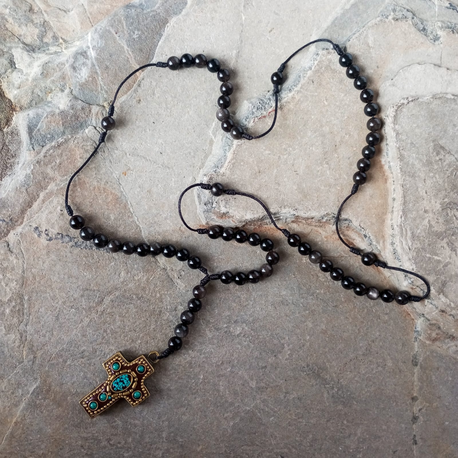 Esta camándula en Piedra Obsidiana está compuesta por esferas cuidadosamente pulidas que resaltan la intensidad y el acabado natural de la piedra, creando una pieza sobria y poderosa. Su diseño se complementa con una Cruz Nepalí, que aporta un carácter espiritual y simbólico, convirtiéndola en un accesorio especial tanto para uso personal como para momentos de conexión y meditación.