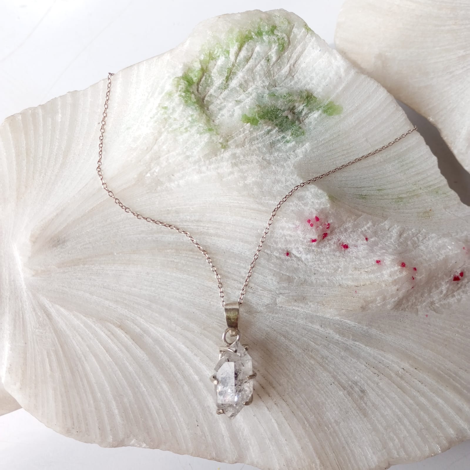 Descubre la elegancia natural y la energía vibrante del cuarzo Herkimer con nuestro dije de plata. Este impresionante dije presenta un cristal auténtico de cuarzo Herkimer. Cada cristal es una obra de arte natural, formado en Herkimer County, Nueva York, y cuidadosamente engarzado en plata 925 de alta calidad para garantizar durabilidad y belleza duradera. Perfecto para cualquier ocasión, nuestro dije en plata con cuarzo Herkimer es más que una joya: es una declaración de estilo que complementa cualquier atuendo, ya sea casual o elegante. Es ideal como un regalo significativo para alguien especial o como un regalo personal que te recuerda la belleza y el poder de la naturaleza en su forma más pura.