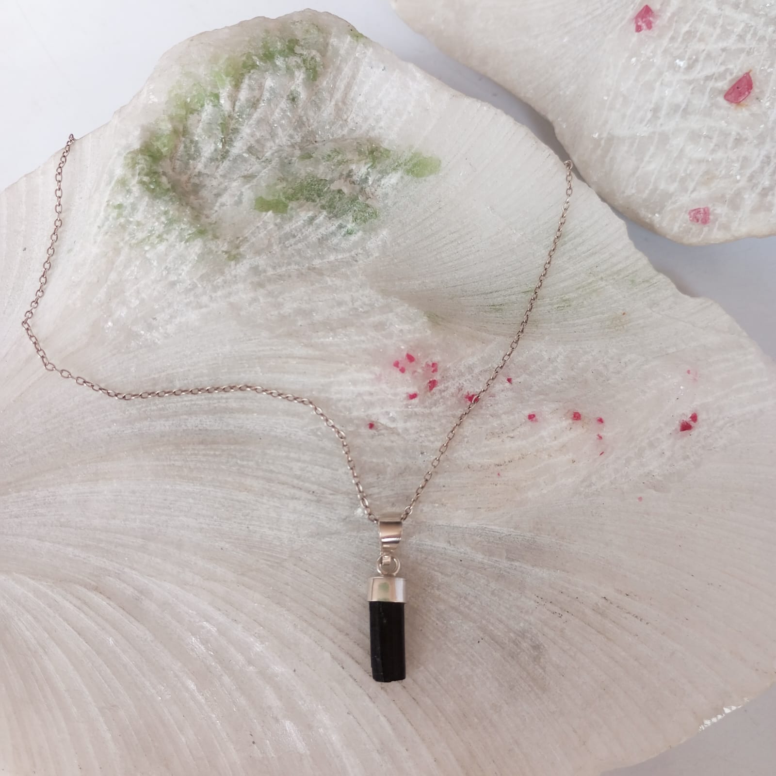 Este dije en plata presenta un diseño sencillo y natural, con un engaste superior que sostiene la piedra en su forma alargada y prismática, resaltando su belleza auténtica y oscura. Su estilo minimalista lo convierte en una pieza versátil, fácil de llevar en cualquier ocasión y cargada de simbolismo.