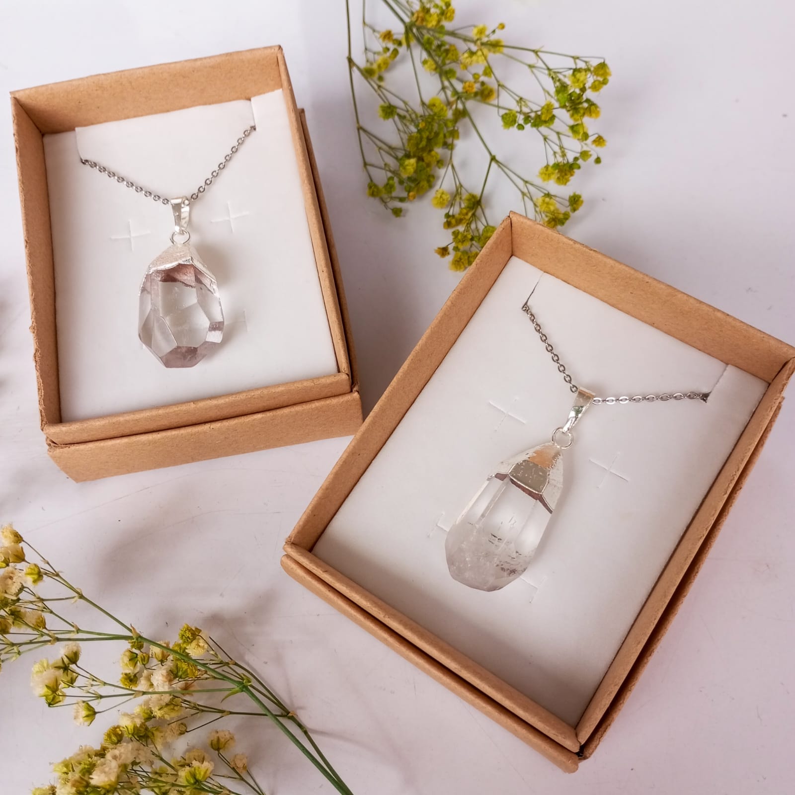 Este dúo incluye dos dijes de cuarzo cristal facetado cuidadosamente seleccionados para formar una pareja visualmente armónica. Cada uno está engastado en electroplata plateada (fantasía) y acompañado por su cadena en acero y su caja tipo kraft, ideal para obsequio o presentación.