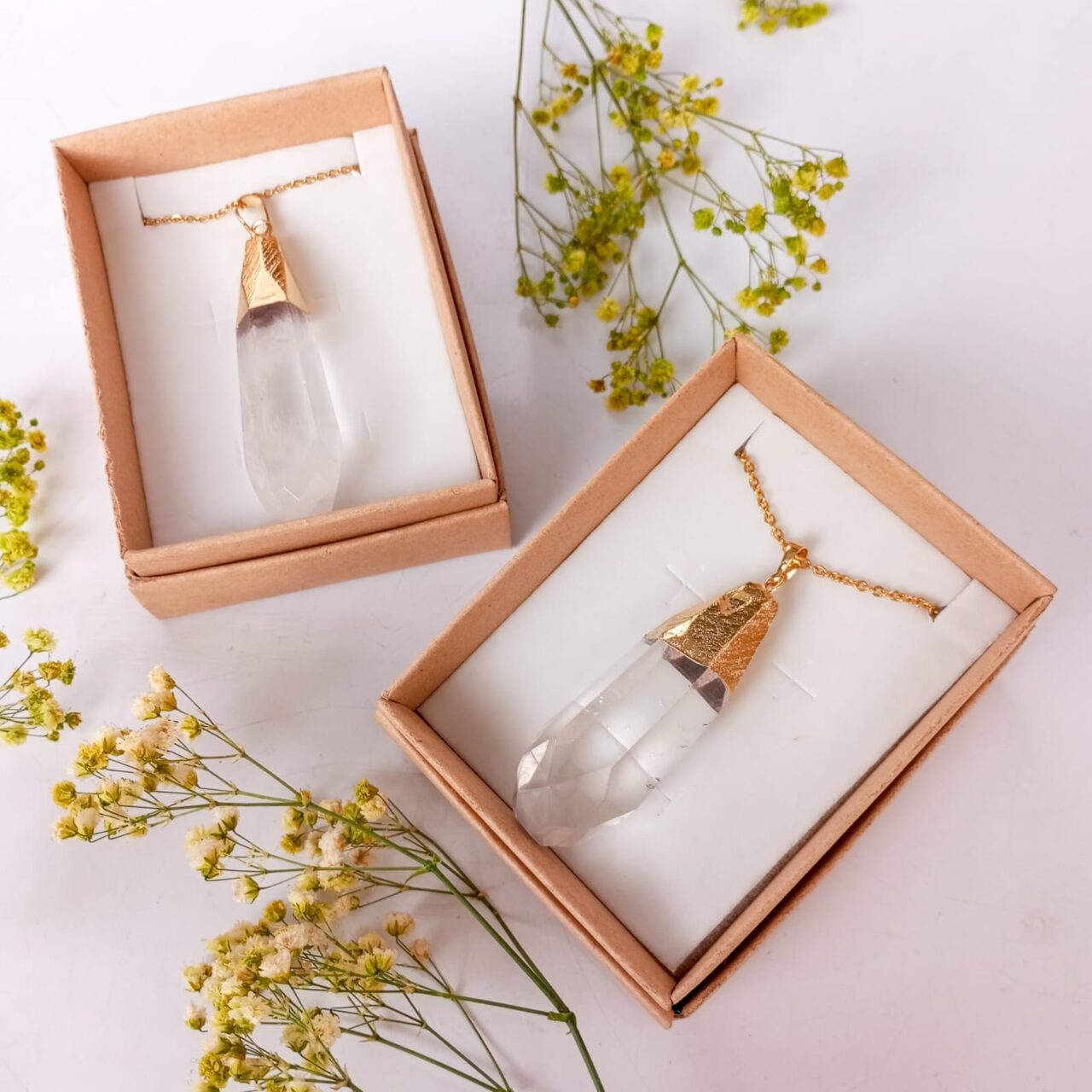 Este dúo incluye dos dijes de cuarzo cristal facetado cuidadosamente seleccionados para formar una pareja visualmente armónica. Cada uno está engastado en electroplata dorado (fantasía) y acompañado por su cadena en acero y su caja tipo kraft, ideal para obsequio o presentación.