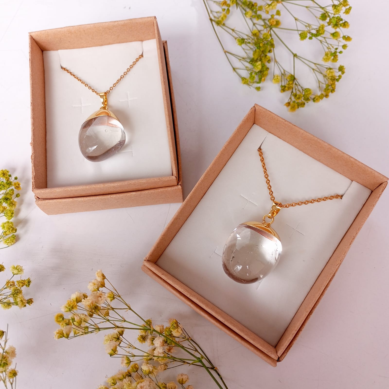 Nota: Es importante mencionar que, aunque es cuarzo cristal, no todas las piezas son completamente translúcidas, y pueden presentar tanto vetas internas como detalles externos propios de su naturaleza. Esto hace que cada dije sea único, con formas y tonalidades ligeramente distintas. Aunque hacen parte de una misma referencia, los dijes se envían según disponibilidad, por lo que puede haber variaciones entre uno y otro, incluso dentro de la misma línea.