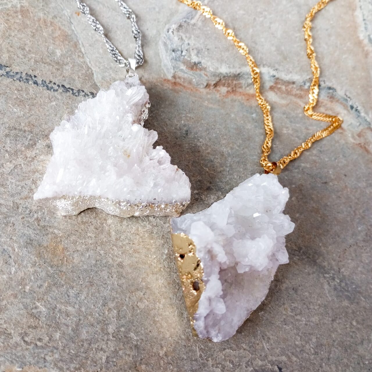 Las drusas pueden variar en forma, tamaño, textura y cantidad de puntas, ya que cada cristal se forma de manera distinta. Aunque pertenecen a la misma referencia, no existen dos iguales, lo que convierte cada duo en una pieza especial, auténtica y cargada de intención.