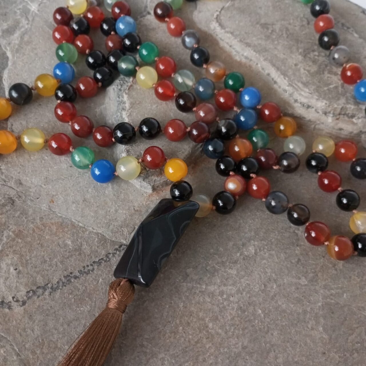 La Ágata es una piedra profundamente conectada con la tierra y la armonía interior. Su energía es suave pero firme, brindando estabilidad emocional, equilibrio y protección. Cada tono dentro de esta piedra representa diferentes matices de la naturaleza: fuerza, calma, expansión y renovación. Es conocida por armonizar cuerpo, mente y espíritu, creando una sensación de paz y enraizamiento. Este Japa Mala está elaborado con cuentas de Ágata en una hermosa mezcla de colores, que simbolizan diversidad y vitalidad. Como punto central, se destaca un gurú en Ágata, piedra que amplifica la conexión con uno mismo y con la energía que fluye durante prácticas espirituales o meditaciones. Su borla marrón complementa el diseño aportando un toque cálido y natural.