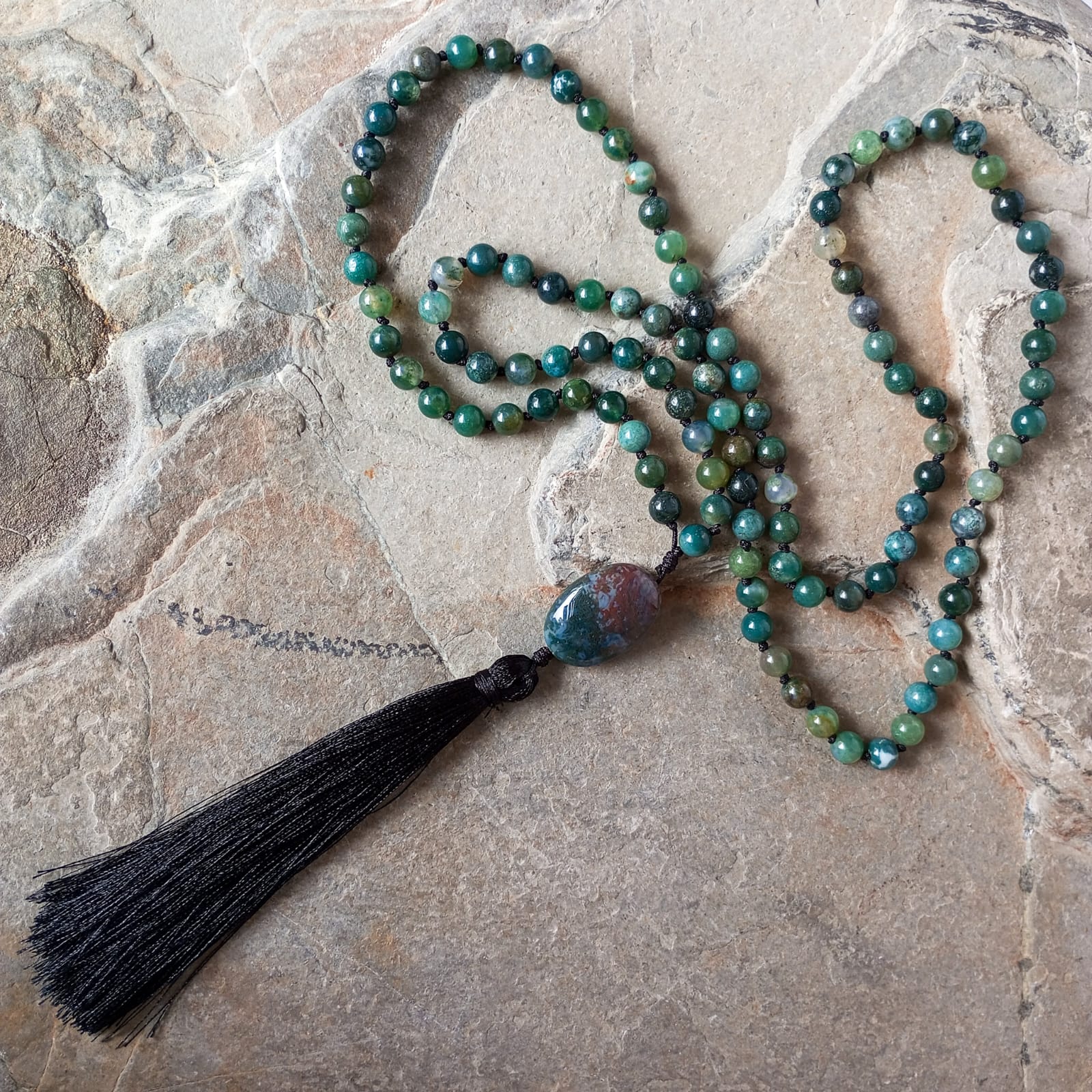 La Ágata Musgo es una piedra profundamente conectada con la naturaleza. Sus tonalidades verdes, entrelazadas con matices blancos y azulados, evocan la textura de los bosques y la serenidad de la tierra húmeda. Es una piedra que inspira calma, equilibrio y crecimiento interior, ayudando a reconectar con la energía natural y con el fluir de la vida. Este Japa Mala está elaborado con cuentas de Ágata Musgo que destacan por su variedad de tonos y vetas únicas, recordando que en la naturaleza no existen dos formas iguales. Es una pieza que invita a respirar con conciencia, encontrar armonía en los procesos personales y mantener la mente centrada durante la meditación o la práctica espiritual. El gurú, una piedra de Ágata Musgo en su forma más orgánica, conserva parte de su aspecto natural, con sus colores entrelazados y texturas propias, aportando un punto de conexión directa con la energía de la tierra. La borla en tono negro complementa la pieza con elegancia y profundidad, resaltando los matices verdes y naturales de las piedras. Ideal para quienes buscan serenidad, conexión con la naturaleza y estabilidad emocional, este Japa Mala es una herramienta energética y estética que acompaña procesos de renovación, claridad y fortaleza interior.