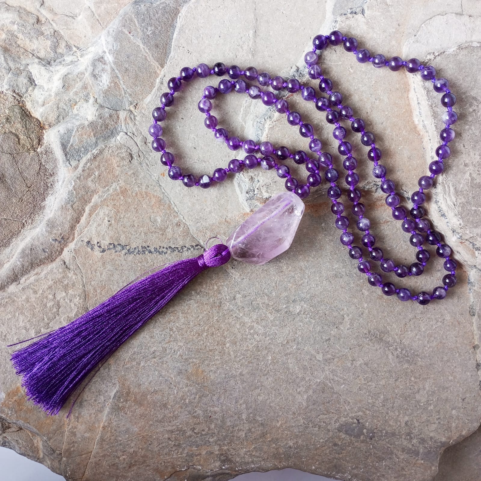 Este Japa Mala está elaborado con cuentas de Amatista natural, piedra reconocida por su energía calmante y su capacidad para favorecer la conexión espiritual y la claridad mental. Cada cuenta refleja tonalidades violetas profundas con sutiles matices traslúcidos que capturan la luz y evocan serenidad. El guru bead, elaborado en Amatista tamboreada, conserva vetas internas y externas propias de la piedra, con zonas lisas y otras naturalmente rugosas que revelan su autenticidad y carácter único. El conjunto se completa con un borlón en tono violeta, símbolo de espiritualidad y transformación interior. Ideal para la meditación, afirmaciones o como amuleto de energía armonizadora.