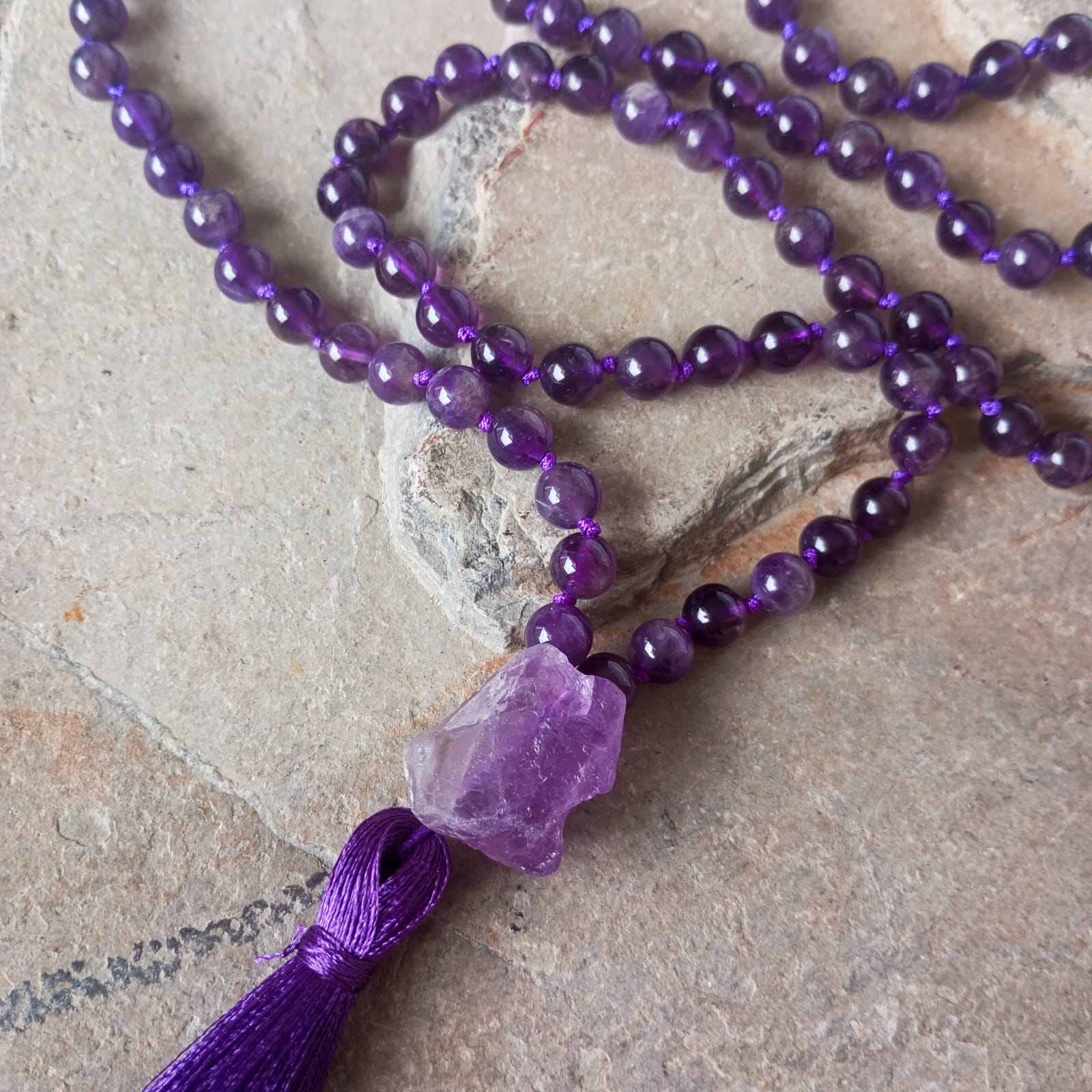 Este Japa Mala está elaborado con cuentas de Amatista en un tono púrpura intenso y vibrante. Su guru en amatista en bruto conserva la belleza natural y orgánica de la piedra, recordando que cada camino espiritual es único y auténtico en su forma. La borla en tono morado complementa la energía mística y serena de la pieza. Una herramienta poderosa para quienes caminan con intención, cultivando la paz interior y la conexión con lo divino desde la autenticidad del corazón.