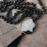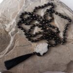 La Obsidiana es una piedra volcánica conocida por su poderosa energía protectora. Actúa como un escudo frente a energías densas, ayudando a liberar bloqueos emocionales y a fortalecer el enraizamiento. Su tono oscuro y profundo no solo simboliza fuerza interior, también invita a la introspección y al equilibrio personal. Es una piedra que acompaña procesos de transformación y protección energética. Este Japa Mala está elaborado con cuentas de Obsidiana pulida, que aportan un brillo elegante y sobrio a la pieza. Como punto central, se destaca un guru en laja de Ágata, piedra que equilibra y armoniza la energía, conectando con la calma interior. El diseño se complementa con una borla negra que aporta movimiento y sutileza, dando como resultado una pieza poderosa tanto en estética como en energía.