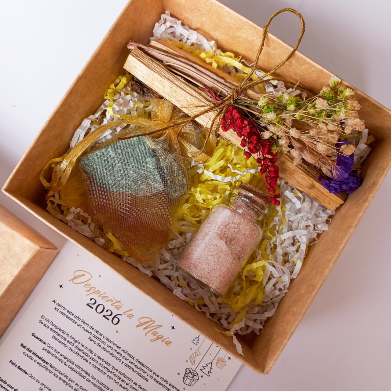 Nota: Cada Kit contiene elementos únicos. Cada cuarzo tiene una forma distinta, el ramo de salvia es único y no hay dos kits con piezas idénticas. Las formas de los elementos pueden variar respecto a las de la foto, por lo que no recibirás exactamente las mismas piezas que se muestran. Además, el color o la textura del papel que acompaña al kit pueden cambiar según la disponibilidad.