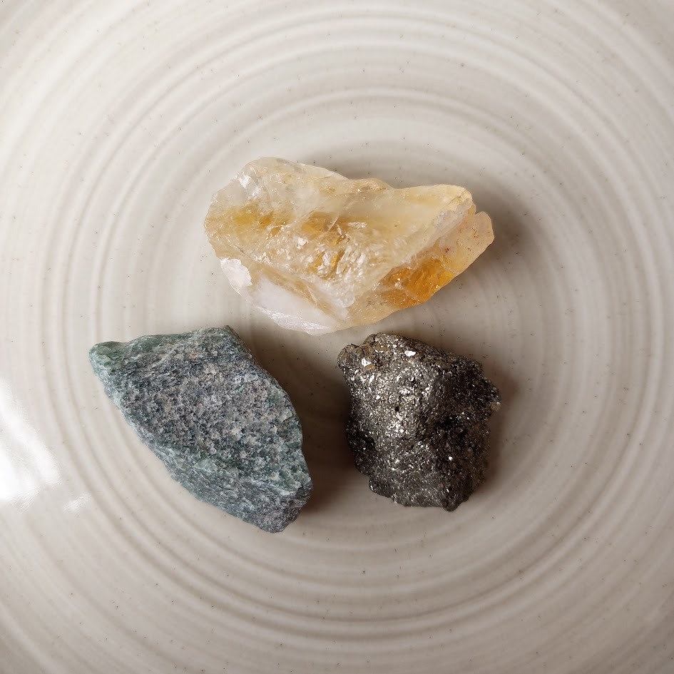 - Cuarzos: Con sus energías vibrantes, los cuarzos despiertan tu conexión con el universo, potenciando tu capacidad de manifestar sueños y atraer abundancia. Son piedras poderosas que te acompañarán en tu camino hacia la prosperidad y el bienestar. (Citrino, Aventurina y Pirita en bruto)