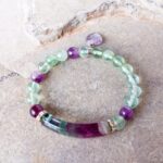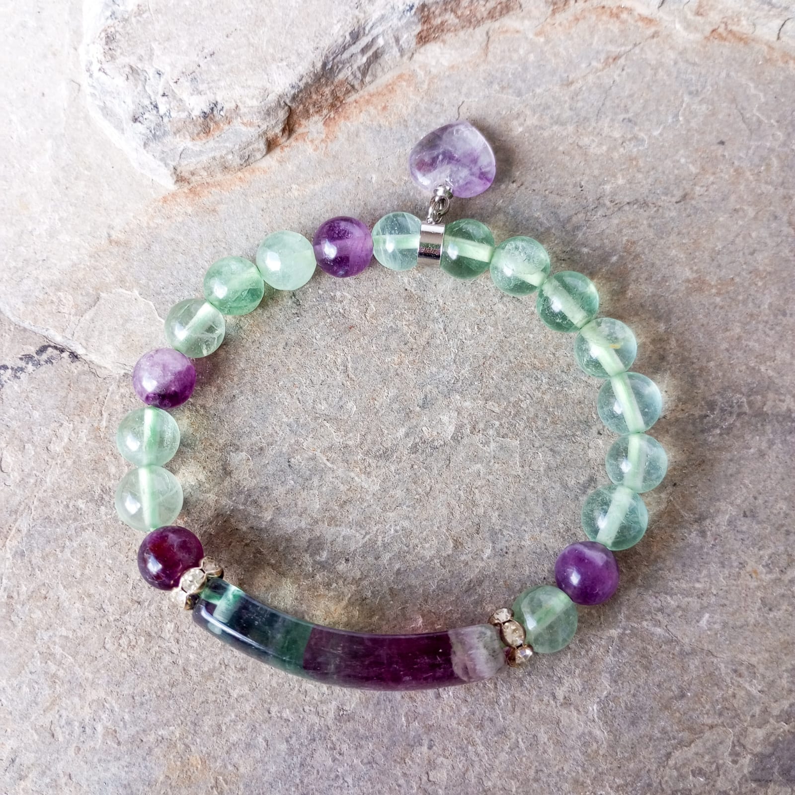 Esta pulsera está elaborada con cuentas de Fluorita natural. Incluye una placa central también en Fluorita, que aporta presencia y equilibrio al diseño, junto a un dije del mismo mineral. Los separadores y apliques con brillantes son piezas de fantasía, utilizados como detalles decorativos que añaden brillo y contraste a la pieza. Una pulsera delicada y armoniosa, ideal para llevar como recordatorio de claridad, enfoque y equilibrio mental en el día a día.