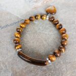 Esta pulsera está elaborada con cuentas de Ojo de Tigre natural. Incluye una placa central también en Ojo de Tigre, que aporta presencia y equilibrio al diseño, junto a un dije del mismo mineral. Los separadores y apliques con brillantes son piezas de fantasía, utilizados como detalles decorativos que añaden brillo y contraste a la pieza. Una pulsera sobria y elegante, ideal para llevar como recordatorio de protección, enfoque y seguridad personal en el día a día.