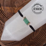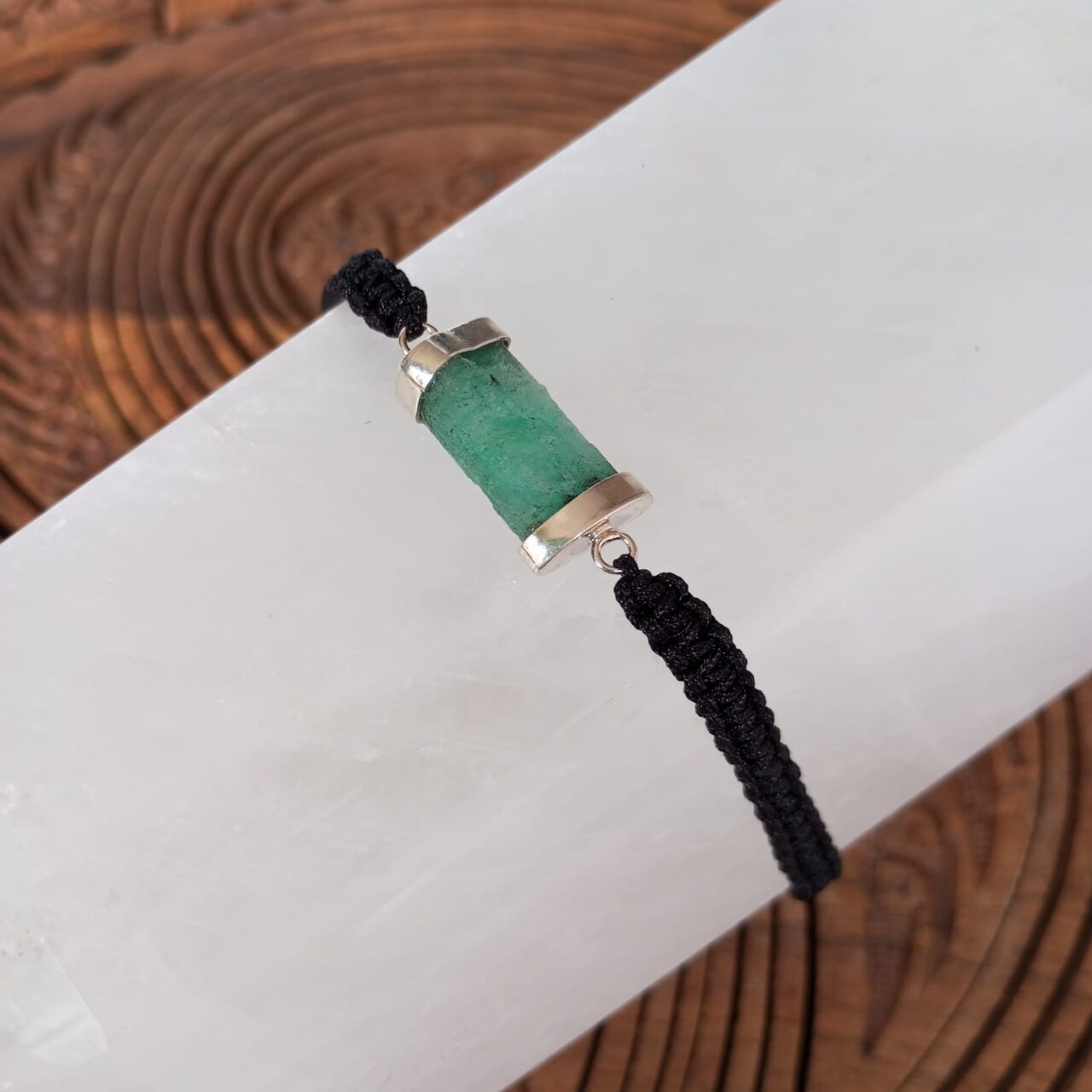 Esta pulsera está tejida a mano en hilo negro, resaltando en el centro una esmeralda natural con proceso semipulido, engarzada en plata, lo que realza su forma y su carácter orgánico. El contraste entre el verde de la piedra y la sobriedad del tejido crea una joya equilibrada, elegante y con identidad propia. La piedra se sostiene mediante un engaste en plata que la mantiene firme y visible en el centro del diseño. El tejido en hilo negro, elaborado a mano, es resistente, ajustable y crea un contraste sobrio que permite que la Esmeralda sea el elemento protagonista de la pieza.