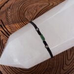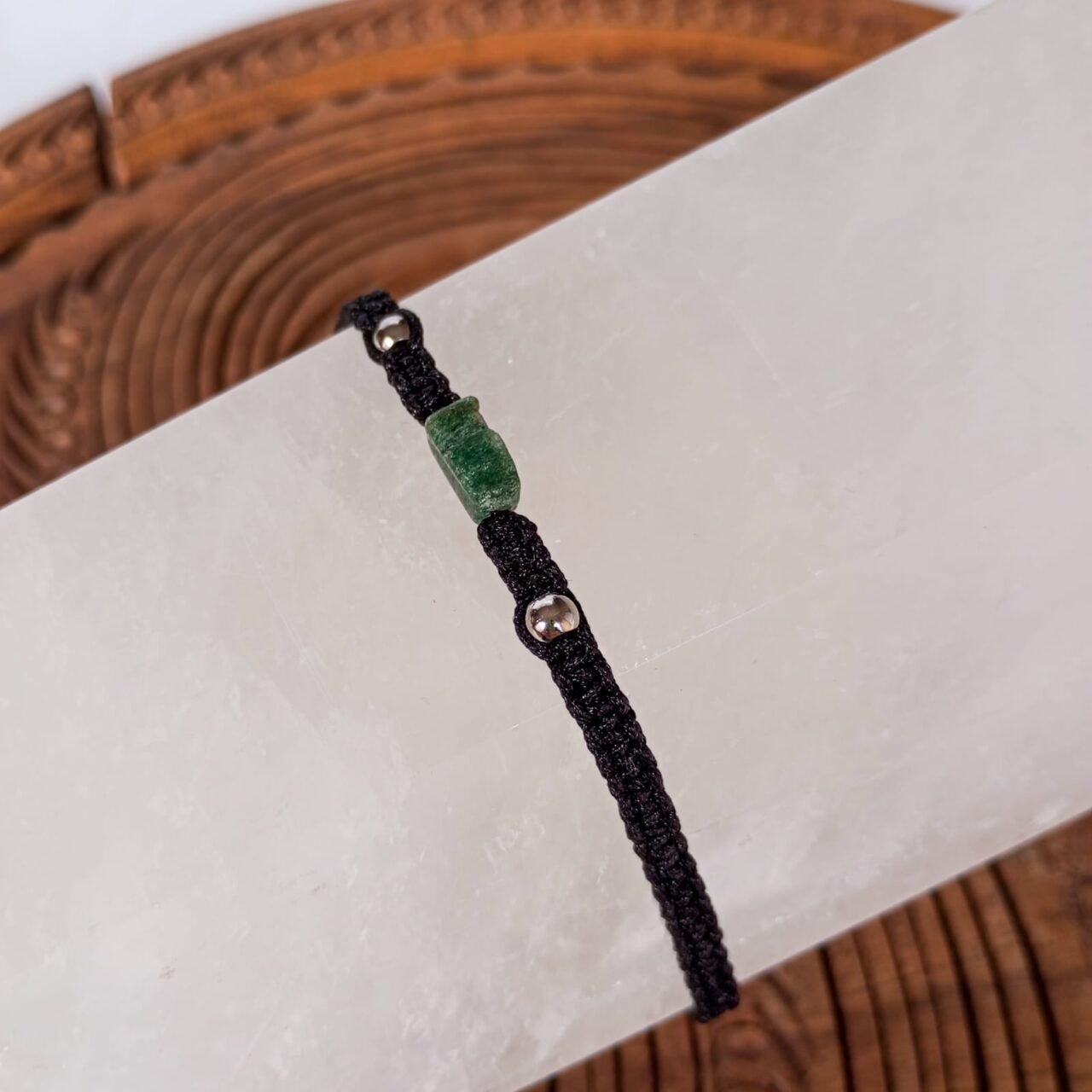 Esta pulsera está tejida a mano en hilo negro, con una esmeralda natural como pieza central, acompañada por balines (esferas) en acero a los lados, que aportan un contraste sutil y moderno. Su diseño es delicado, versátil y de estilo atemporal, ideal para el uso diario o para complementar un look con intención y personalidad.