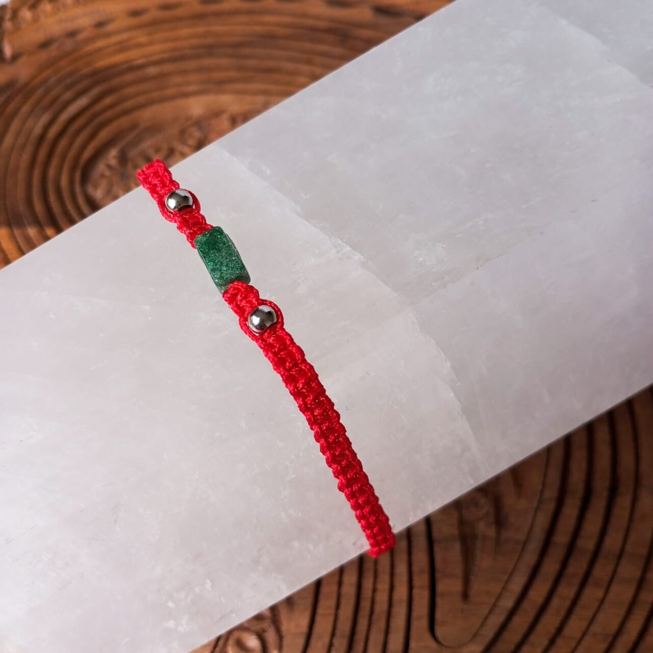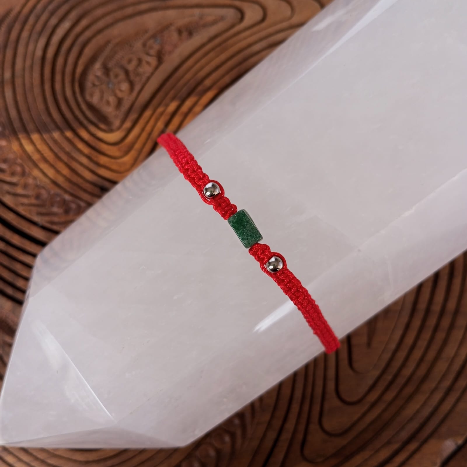 Esta pulsera está tejida a mano en hilo rojo, con una esmeralda natural como pieza central, acompañada por balines (esferas) en acero a los lados, que aportan un contraste sutil y moderno. Su diseño es delicado, versátil y de estilo atemporal, ideal para el uso diario o para complementar un look con intención y personalidad.