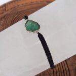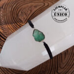 Esta pulsera está tejida a mano en hilo negro, con una esmeralda natural en bruto como protagonista, sostenida por herrajes en plata que realzan su forma orgánica sin alterar su esencia. Cada detalle está cuidadosamente ensamblado para resaltar la belleza natural de la piedra y crear una joya equilibrada, sobria y llena de intención. El tejido en hilo negro, elaborado a mano, es resistente, ajustable y crea un contraste sobrio que permite que la Esmeralda sea el elemento protagonista de la pieza.