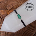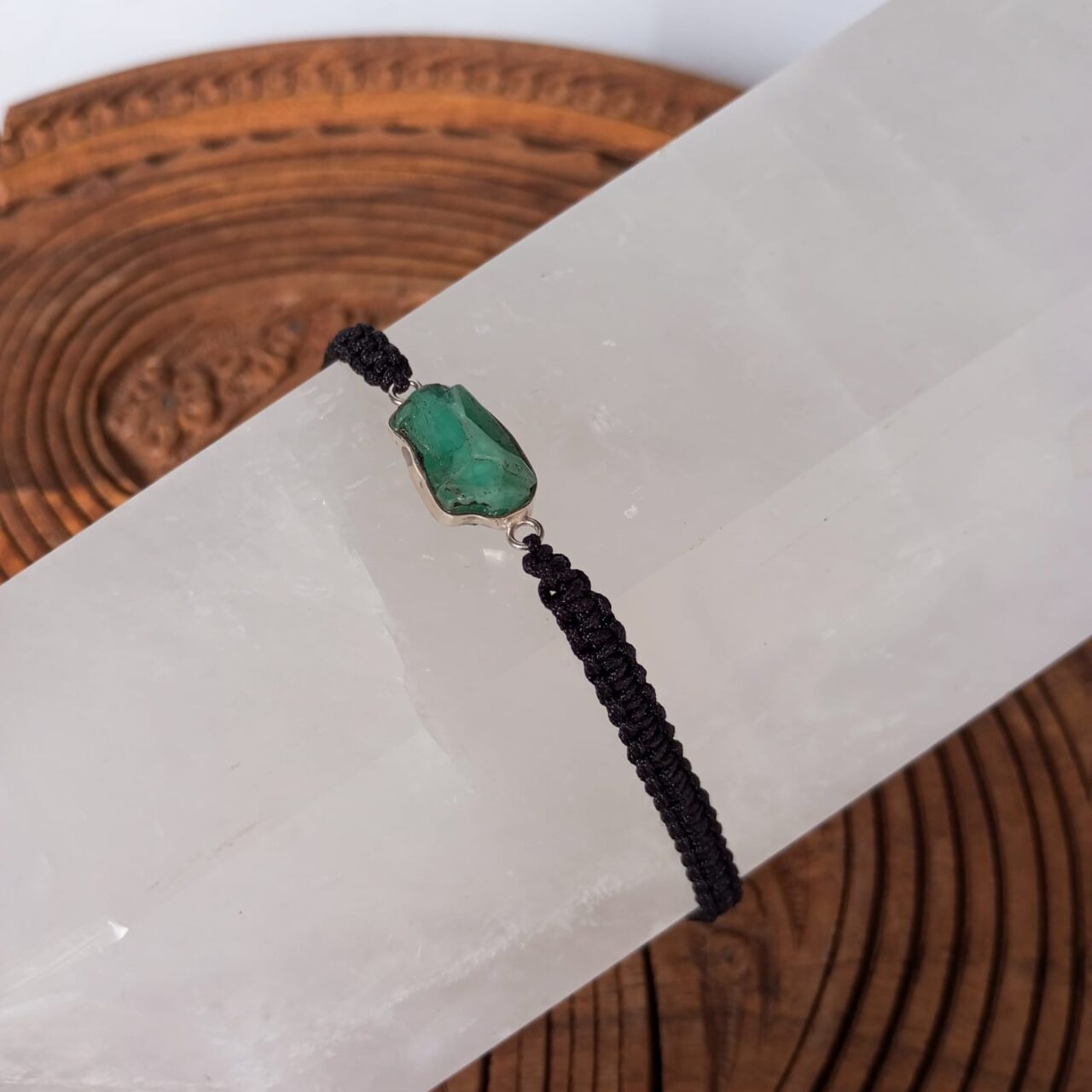 Esta pulsera está tejida a mano en hilo negro, con una esmeralda natural en bruto como protagonista, sostenida por herrajes en plata que realzan su forma orgánica sin alterar su esencia. Cada detalle está cuidadosamente ensamblado para resaltar la belleza natural de la piedra y crear una joya equilibrada, sobria y llena de intención. El tejido en hilo negro, elaborado a mano, es resistente, ajustable y crea un contraste sobrio que permite que la Esmeralda sea el elemento protagonista de la pieza.