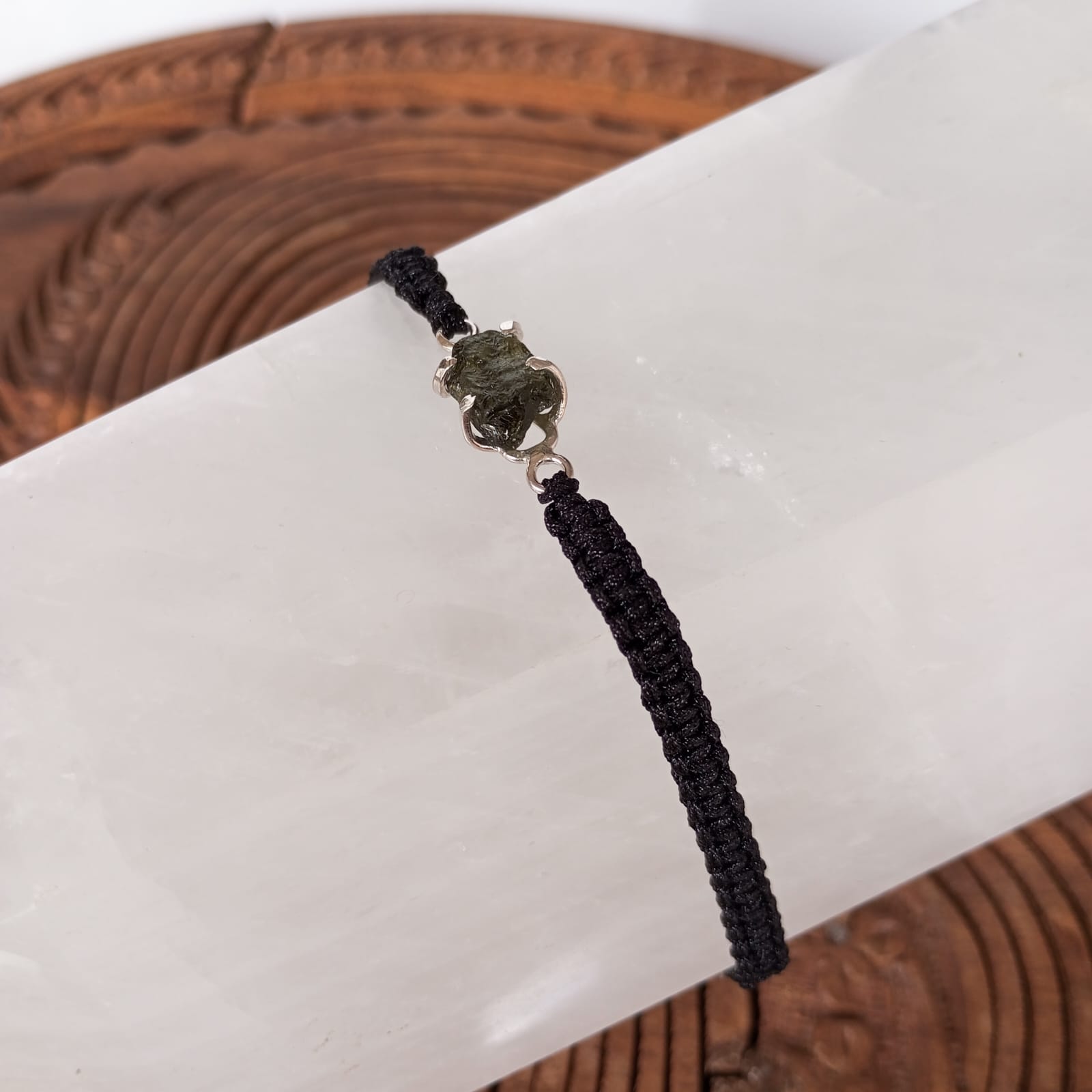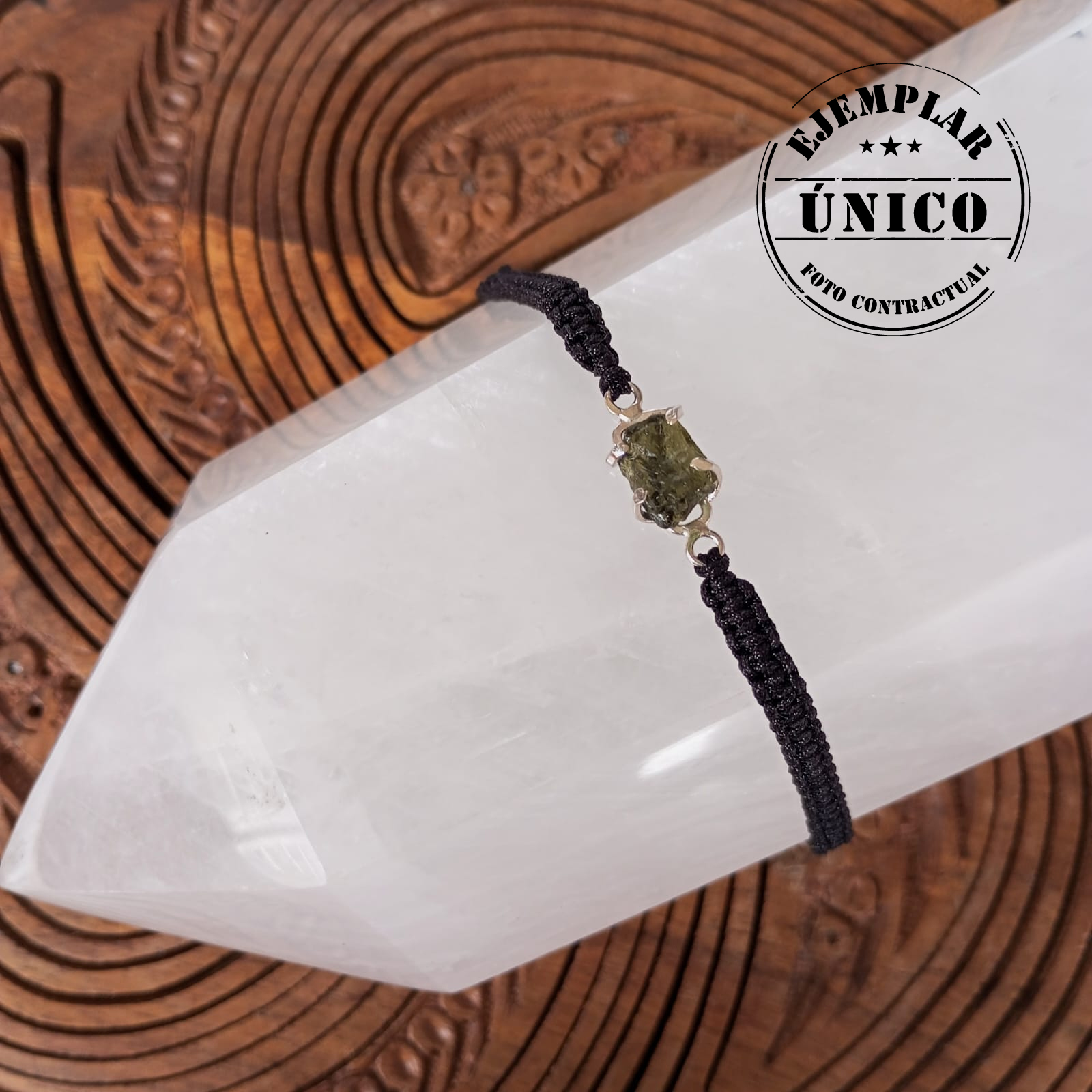 En esta pulsera, la Moldavita se presenta en su forma en bruto, resaltando su apariencia auténtica y el brillo irregular característico de su superficie. Está engastada en plata y sostenida por un tejido artesanal en hilo negro, ajustable y resistente. Su diseño sencillo permite que la piedra sea la protagonista, aportando un toque distintivo y natural. La versatilidad de esta pulsera permite que se adapte a cualquier ocasión, desde momentos cotidianos hasta eventos especiales.