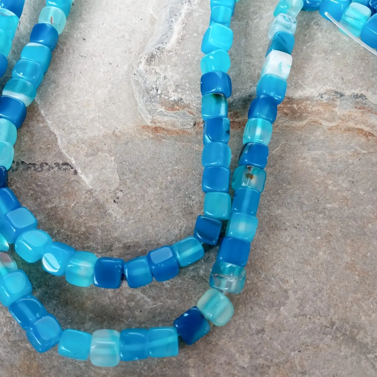 Sarta en piedra Ágata Azul en forma de cuadritos, ideal para la creación de collares, pulseras y otros accesorios. Su tono azul, con variaciones que van desde intensos matices hasta suaves tonalidades, aporta un toque de elegancia y equilibrio a cada diseño.