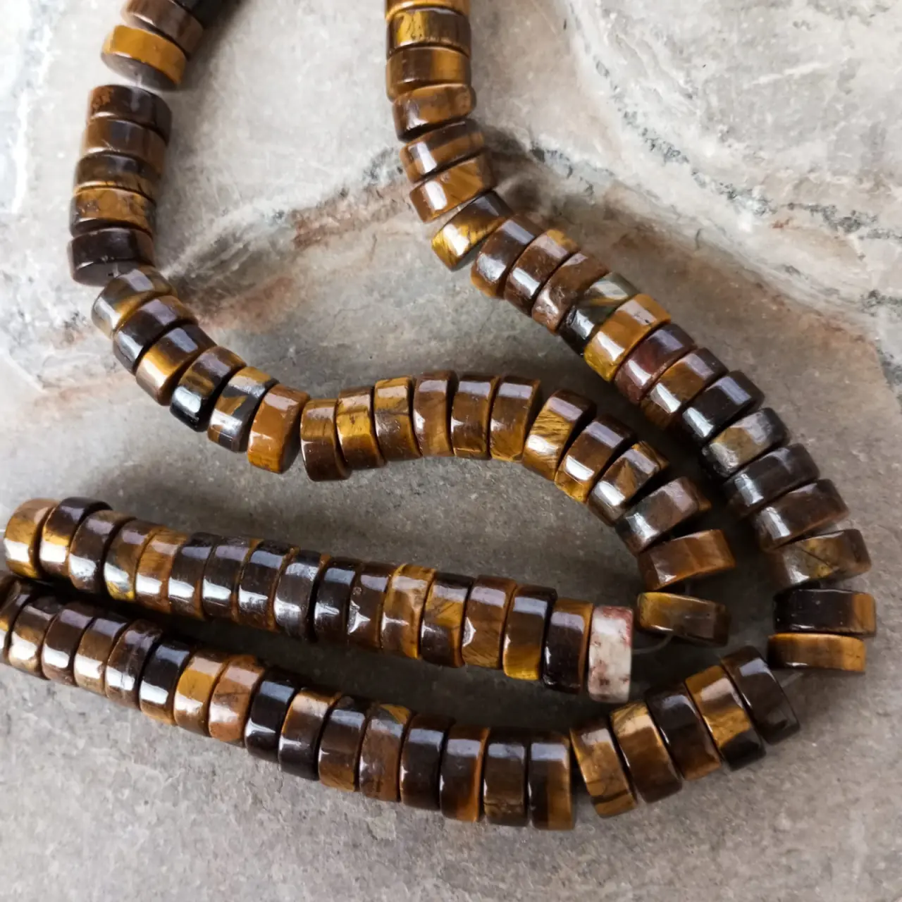 El Ojo de Tigre, con su brillo sedoso y reflejos dorados, es una piedra asociada con la fuerza y la protección. Esta tira de cuentas en forma de disco liso resalta su distintivo efecto tornasolado, perfecto para la creación de collares, pulseras y otros accesorios con un estilo elegante y enérgico. Cada cuenta presenta vetas únicas que reflejan la luz de manera hipnótica, haciendo de cada diseño una pieza especial. Ideal para quienes buscan incorporar la energía y el carácter del Ojo de Tigre en sus creaciones.